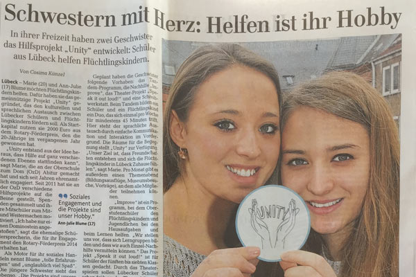"In ihrer Freizeit haben zwei Geschwister das Hilfsprojekt „Unity“ entwickelt: Schüler aus Lübeck helfen Flüchtlingskindern."