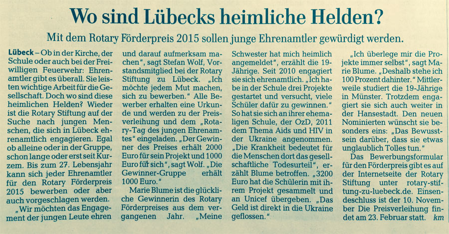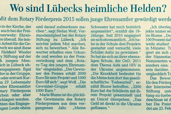 "Die Rotary Stiftung zu Lübeck schreibt wieder ihren Förderpreis für junge Menschen und Gruppen aus, die sich ehrenamtlich für das Gemeinwesen engagieren."